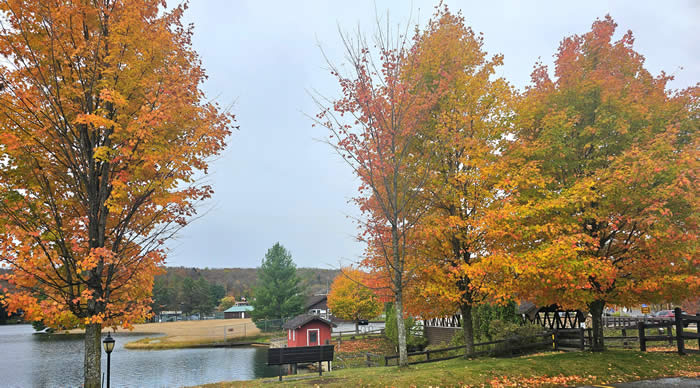 Predominating colors: Orange and gold, with some dark reds and yellows. Many leaves are falling, and splashes of color remain on hillsides where bare branches now dominate.